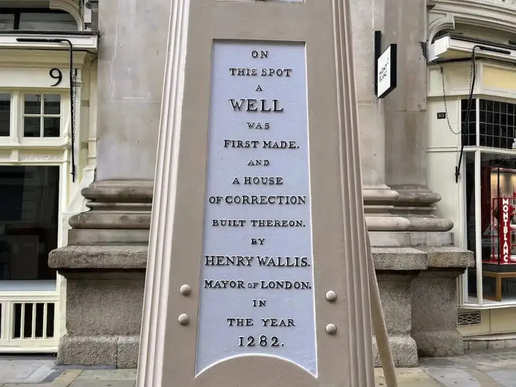 This prison was demolished in 1380 and, later in 1799, the well was re-excavated and became known as the Cornhill Pump.